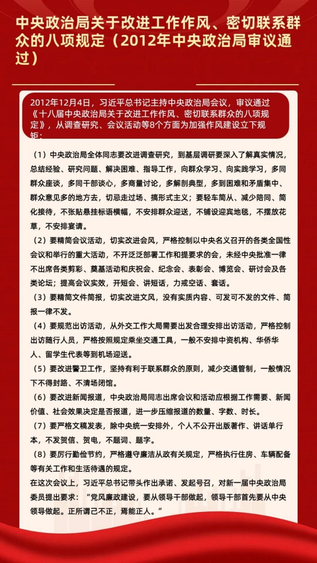 黨的作風就是黨的形象,關系人心向背,決定黨和國家事業(yè)成敗。黨的十八大以來,以習近平同志為核心的黨中央從制定和落實中央八項規(guī)定開局破題,堅持自上而下、以上率下,解決了新形勢下作風建設抓什么、怎么抓的問題。八項規(guī)定一子落地,作風建設滿盤皆活,黨風政風煥然一新,社風民風持續(xù)向好,我們黨以作風建設新氣象贏得了人民群眾信任擁護。